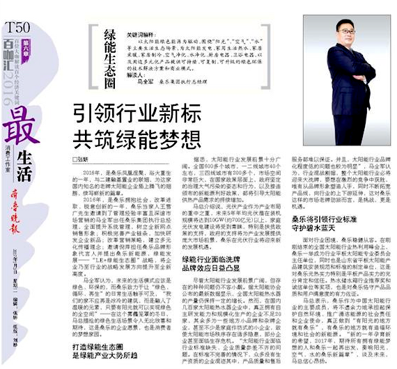 桑樂(lè)作為中國(guó)太陽(yáng)能行業(yè)的主要成員,將不遺余力地承擔(dān)起保護(hù)自然環(huán)境、推廣清潔能源的社會(huì)責(zé)任和企業(yè)使命,真正做到“有陽(yáng)光的地方就有桑樂(lè)”,有桑樂(lè)的地方就有造福環(huán)境和社會(huì)的新能源?!靶碌囊荒暝杏碌南M?2017年,期待所有擁有綠能夢(mèng)想的人和桑樂(lè)一起再出發(fā),奏響陽(yáng)光、空氣、水的桑樂(lè)新篇章”,談及未來(lái),馬總信心昂揚(yáng)。