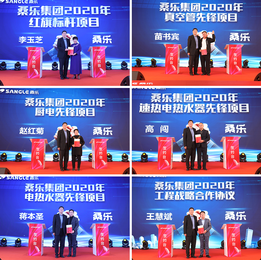 今年春雷,光芒項(xiàng)目的簽約也非常振奮人心,光芒代表著榮耀,也代表著先鋒和領(lǐng)航,簽約者更是各領(lǐng)域佼佼者,在新品推廣、營(yíng)銷(xiāo)活動(dòng)、工程項(xiàng)目等方面皆起到先鋒范作用。在現(xiàn)場(chǎng)所有經(jīng)銷(xiāo)商家人的共用見(jiàn)證下,董事長(zhǎng)先后與李玉芝簽訂“桑樂(lè)集團(tuán)2020年紅旗標(biāo)桿項(xiàng)目”、與苗書(shū)賓簽訂“桑樂(lè)集團(tuán)2020年真空管先鋒項(xiàng)目”、與趙紅菊簽訂“桑樂(lè)集團(tuán)2020年廚電先鋒項(xiàng)目”、與高闖簽訂“桑樂(lè)集團(tuán)2020年速熱電熱水器先鋒項(xiàng)目”、與蔣本圣簽訂“桑樂(lè)集團(tuán)2020年電熱水器先鋒項(xiàng)目”、與王慧斌簽訂“桑樂(lè)集團(tuán)2020年工程戰(zhàn)略合作協(xié)議”,在新的五年征程,向規(guī)模要銷(xiāo)量,向戰(zhàn)略要效益。